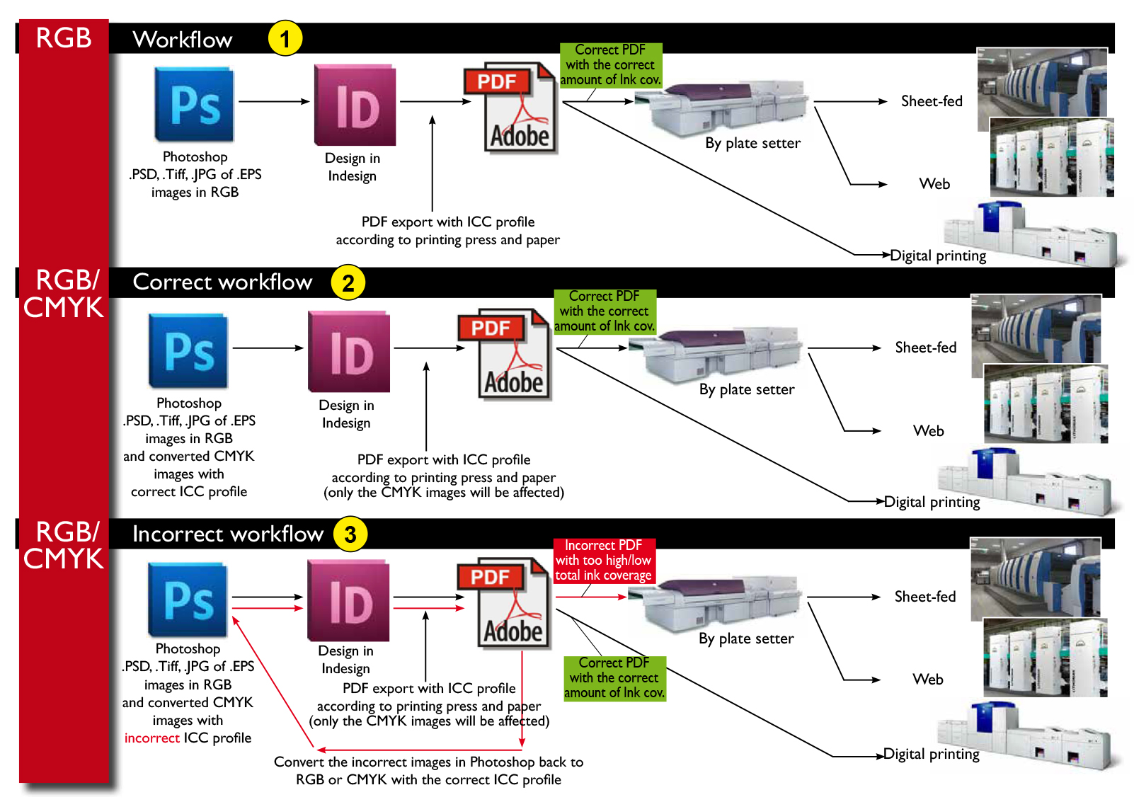 Bevor die PDF-Datei erstellt wird, ist es wichtig, dass die eingefügten Bilder und Fotos das richtige Farbprofil haben. Wir unterscheiden 3 Arbeitsabläufe.